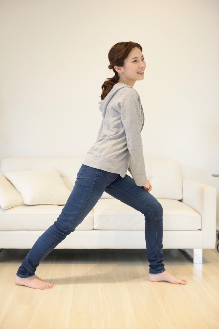 壁に両手をついた状態で、片方の足を前に出し、その足に体重をかけ壁を押します。